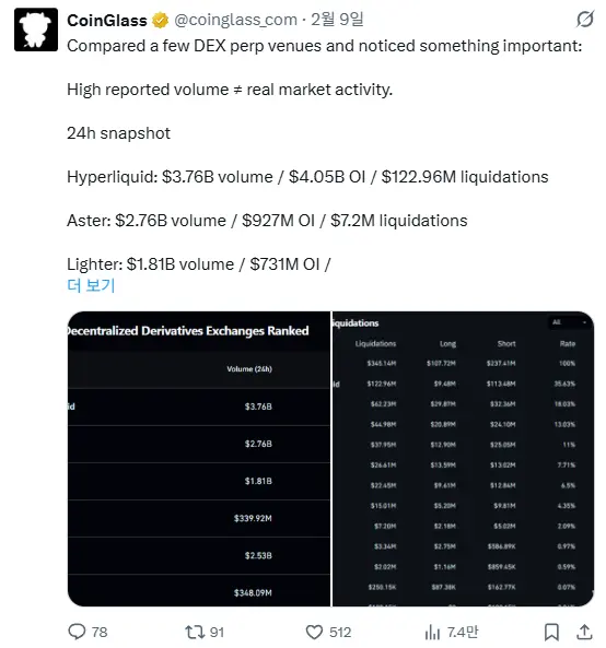 In that debate, @HyperliquidX showed “data we can actually verify” at around daily $3.76B and liquidations of about $123M, and compared to Lighter and Aster, the dominant view was that real users are more actively participating.