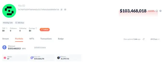 https://debank.com/profile/0x74b97d2097d64b4d2a3317d4bda2dab88b80e7ab : $103M