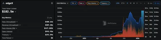 First is the amount of treasury they have already secured as revenue. edgeX recently registered on DefiLlama wallets that have accumulated a treasury of $191.43M in total net profit from last year until now.